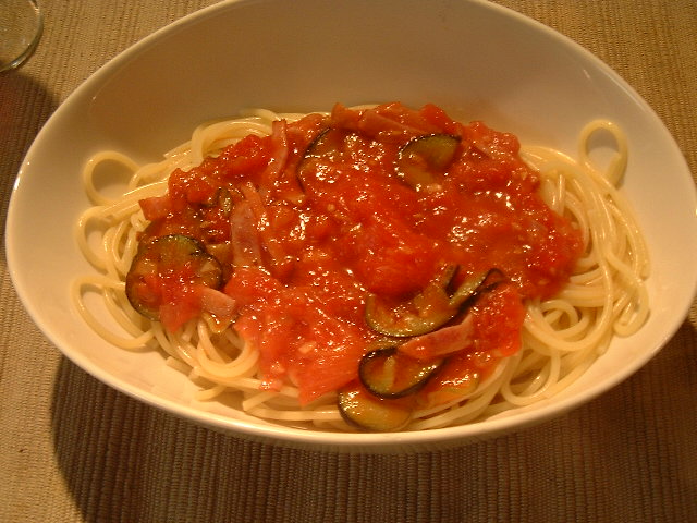 <ナスとハムの トマトソースパスタ> トマトソースが好きなんですよね。基本的に・・ |