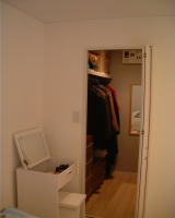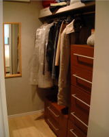 ウォークインクローゼットは、バーと棚を造り付けにし、チェストは松下電工製をつけた。さすがに全てのシーズン物をストックスペースはないため、季節によって入れ替えている。
