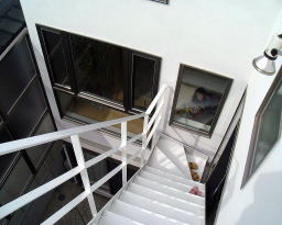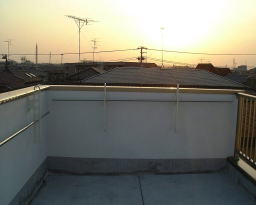 屋上に続く階段は本当は中に入れたかったのだけど、建蔽率の関係で外階段にするしかありませんでした。庇がないので、サンダルなどが濡れること以外はそれほど問題はありません。予算の関係でアルミ製の階段を作れず鉄製(特注)になっているので、錆が発生しやすい点とその汚れが白い壁に影響を及ぼしている点は避けられないのでその点は問題点ですね。この地域は第一種低層住宅地域で10m以上の建築物を建てれないということもあって、360度の景色を見ることができます。と言っても空以外見るべき風景は特にありませんが・・・。春から秋にかけては屋上でビールを飲みながらゆっくりできるのはとてもいいですね。これは最高の気分になります。近くの花火大会も屋上でビール片手に見ることができます。