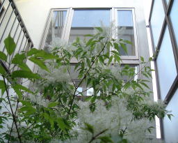 中庭のシンボルツリーは「アオダモ(トネリコ)」です。中庭はお風呂やリビングなどから見えるので季節を感じることができる落葉樹であり、あまり虫がつかないのが剪選定条件でした。その中でアオダモの白い花がとても気に入り、アオダモに決めました。そして花は大正解!!とても綺麗なのです。・・・・・しかし、花が散った後の後始末がとても大変でした。落ち葉のようにほうきで掃くにもいかず、壁や窓にくっついてしまうという最悪の事態。なにげに春がくるのが嫌な気分にさせてくれる要因の一つになってしまいました。でも花はやはりかわいいですよ。